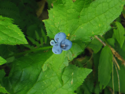 | ブルーベリーみたいなサンカヨウの実 上の方ではお花ですが、下の方ではもう実が色づいている😲 |