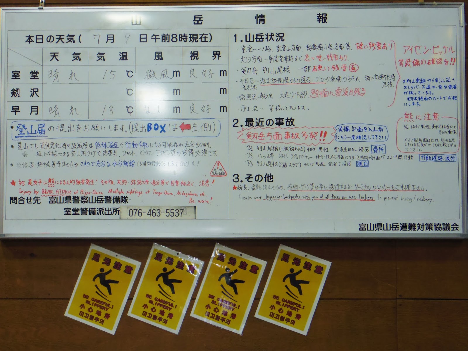 | まずは室堂ターミナルで登山届けを提出して、 階段にあるホワイトボードで情報チェック!! |